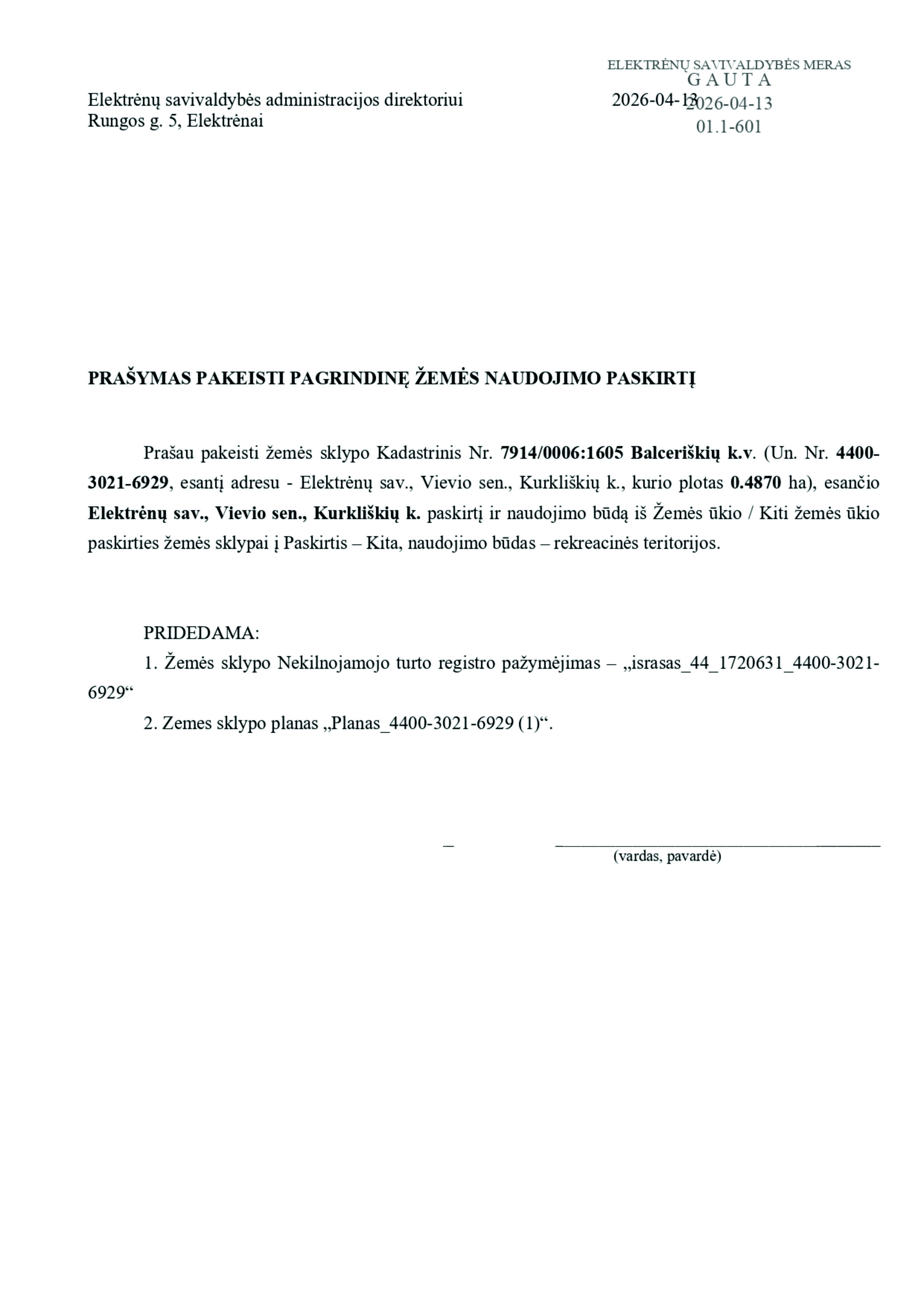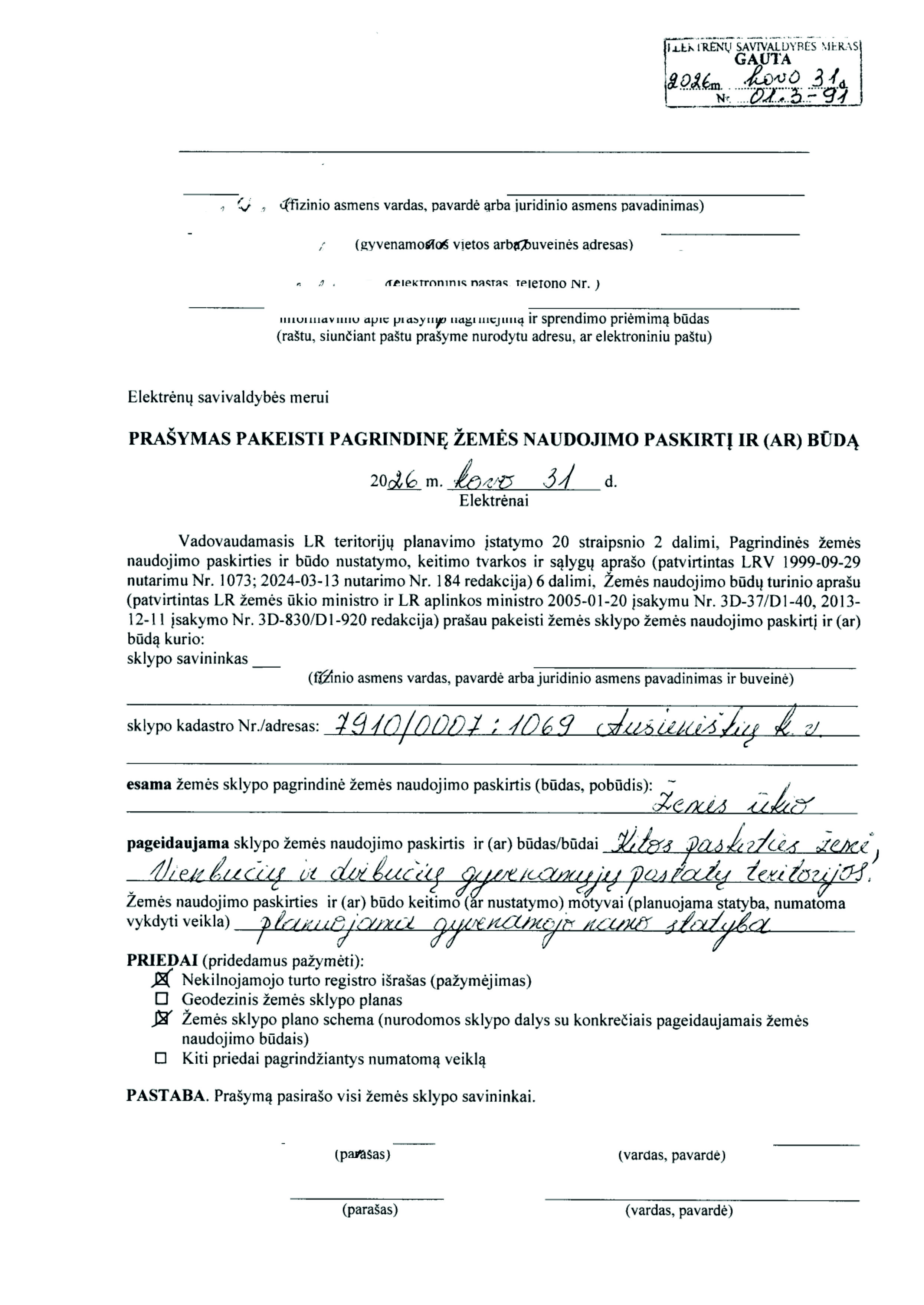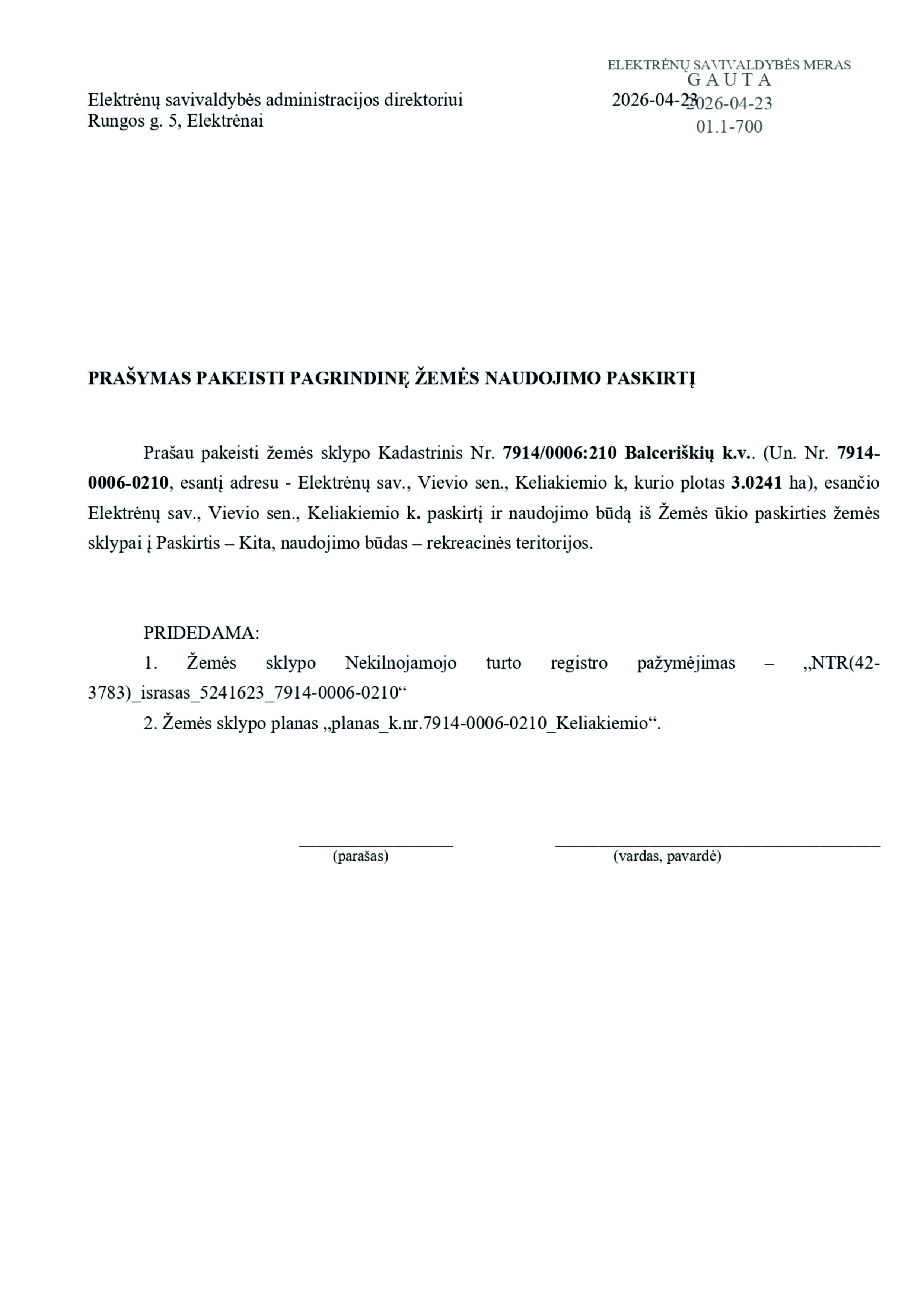 26. PRAŠYMAS DĖL ŽEMĖS SKLYPO, ESANČIO KELIAKIEMIO K., VIEVIO SEN., ELEKTRĖNŲ SAV., (SKL. KADASTRO Nr. 7914/0006:210) PAGRINDINĖS ŽEMĖS NAUDOJIMO PASKIRTIES IR NAUDOJIMO BŪDO PAKEITIMO