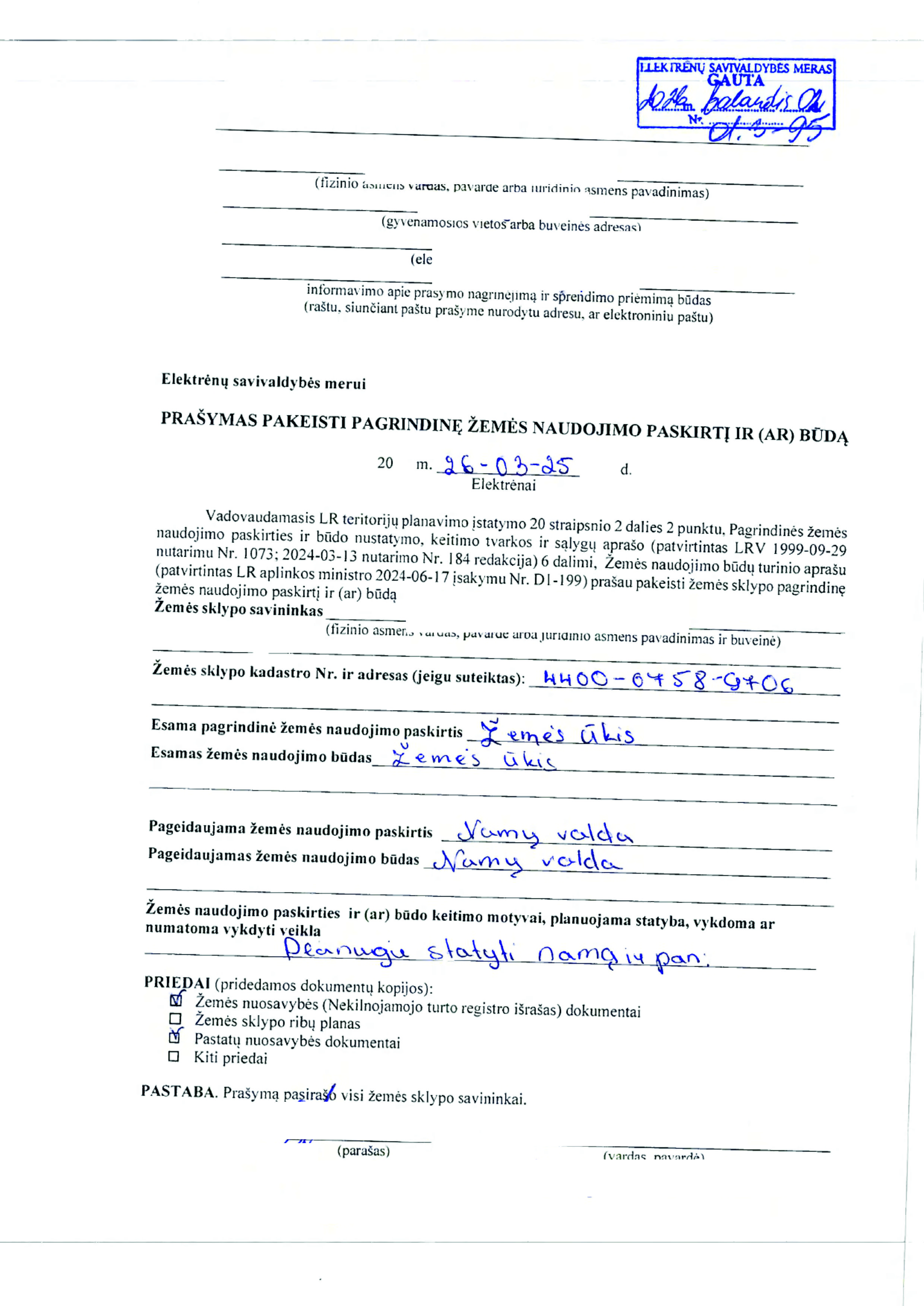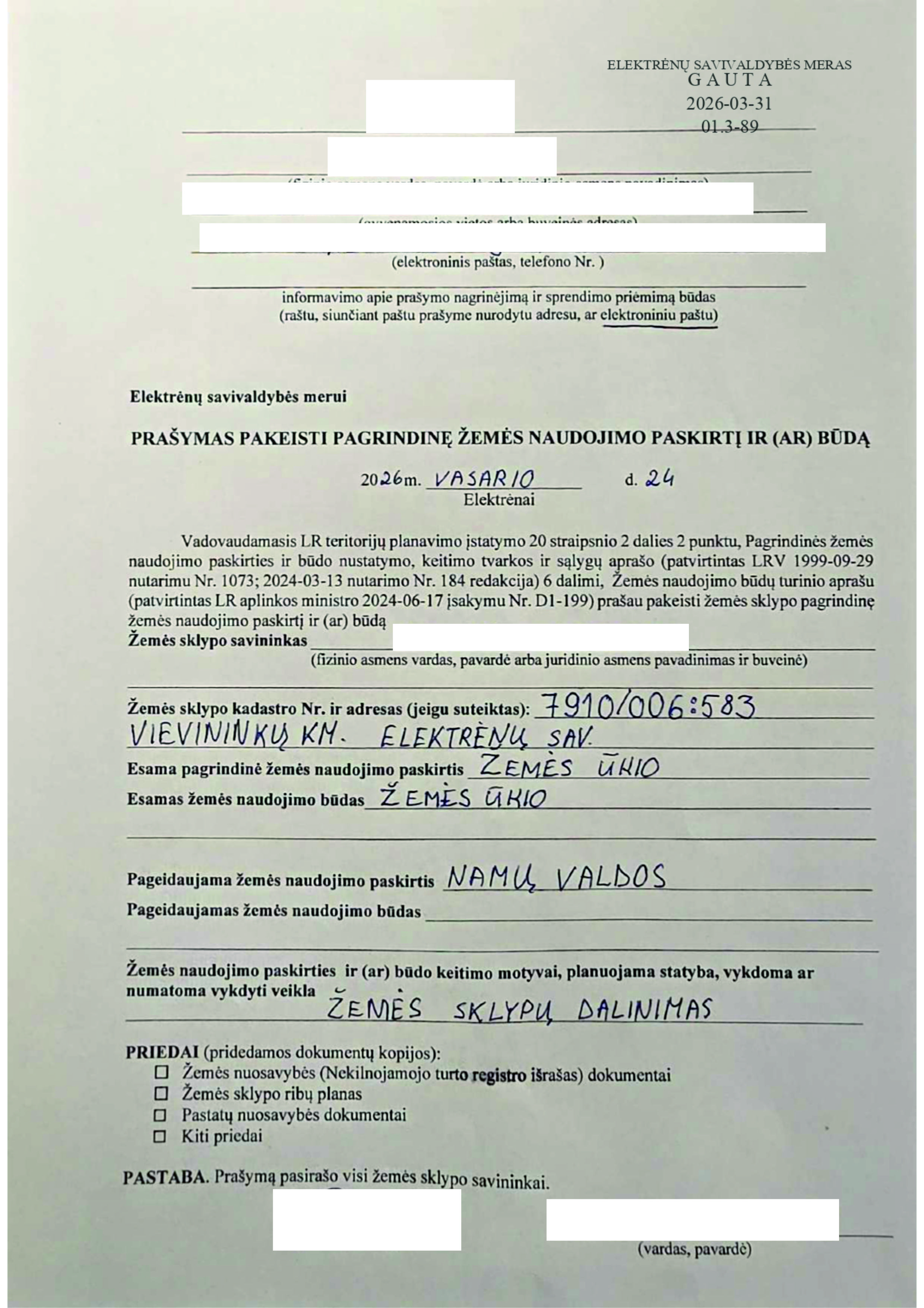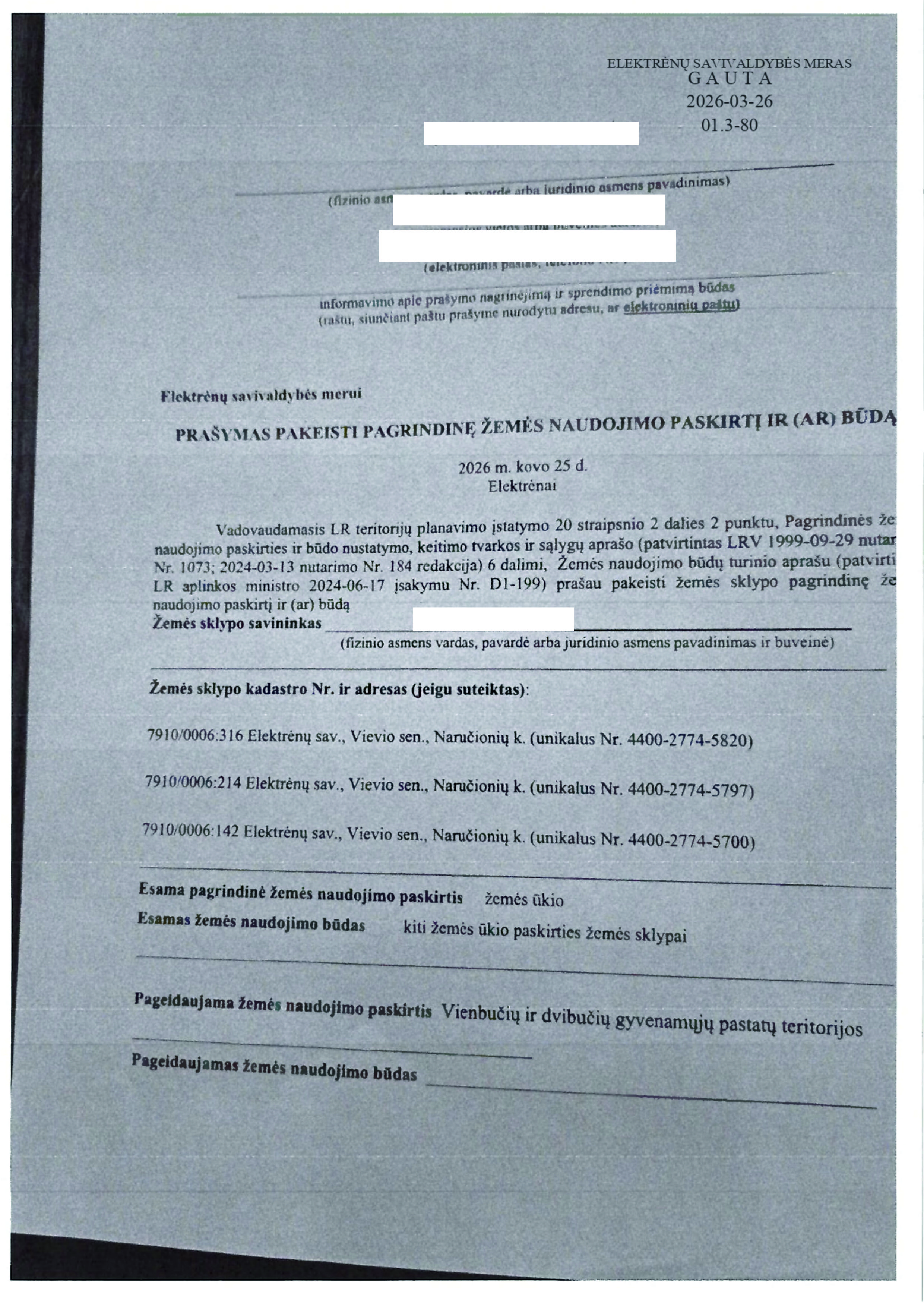 26. PRAŠYMAS DĖL ŽEMĖS SKLYPO, ESANČIO KELIAKIEMIO K., VIEVIO SEN., ELEKTRĖNŲ SAV., (SKL. KADASTRO Nr. 7914/0006:210) PAGRINDINĖS ŽEMĖS NAUDOJIMO PASKIRTIES IR NAUDOJIMO BŪDO PAKEITIMO