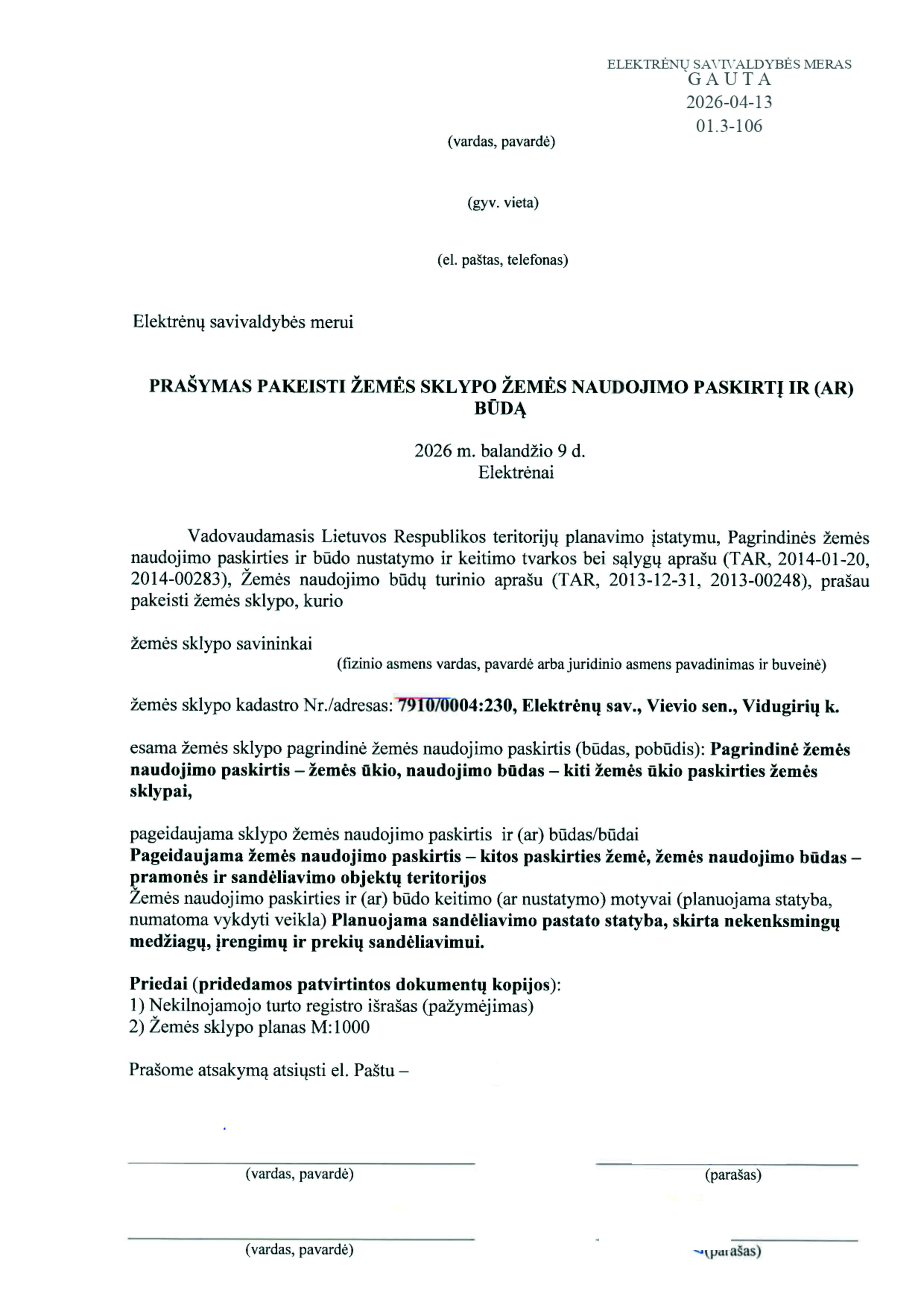 Skelbimas: Vadovaujantis Lietuvos Respublikos teritorijų planavimo įstatymo 20 straipsnio 2 dalies 2 punktu, informuojame, kad 2026-04-13 gautas prašymas (reg. Nr. 01.3-106) pakeisti žemės sklypo pagrindinę žemės naudojimo paskirtį ir būdą.