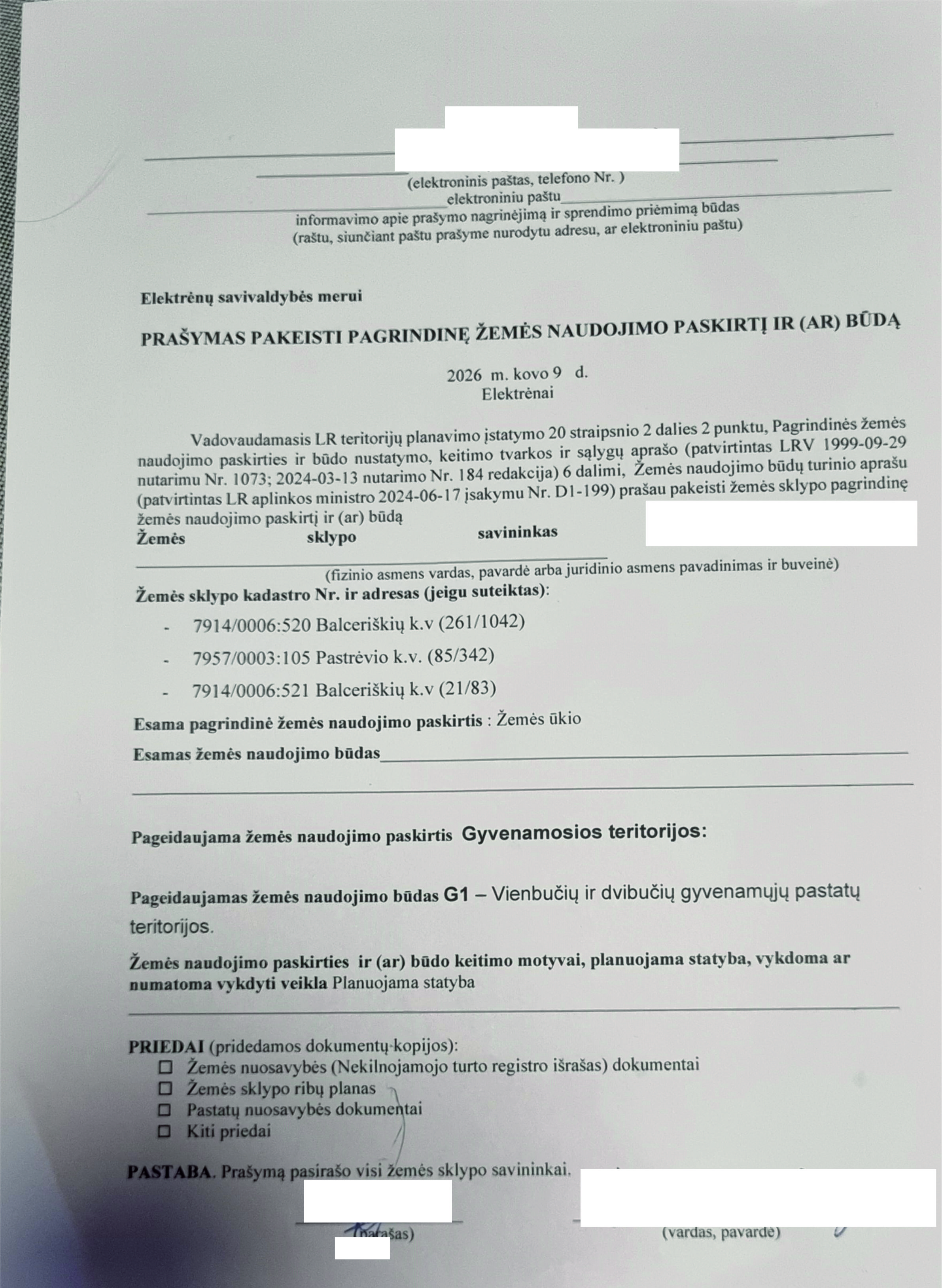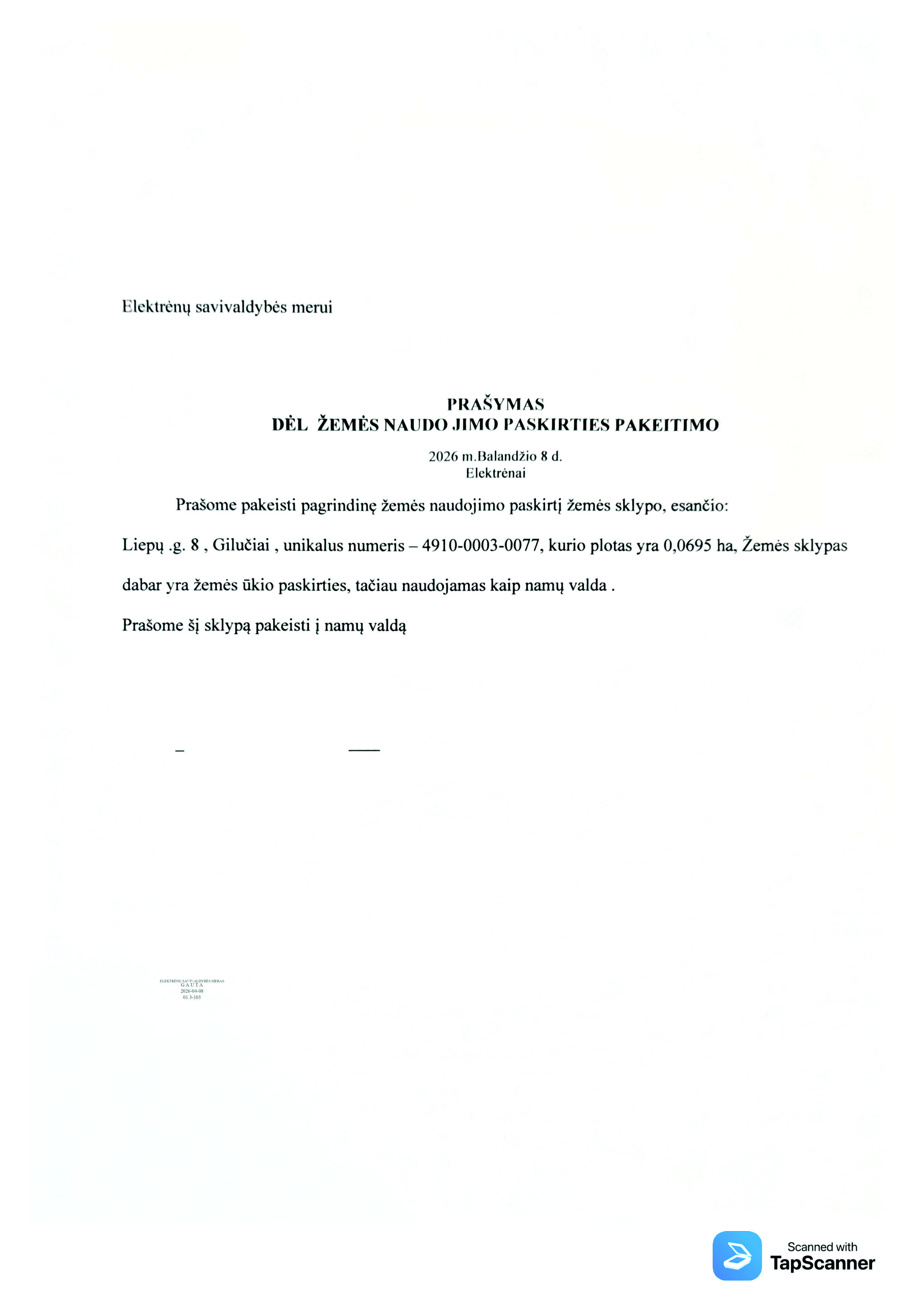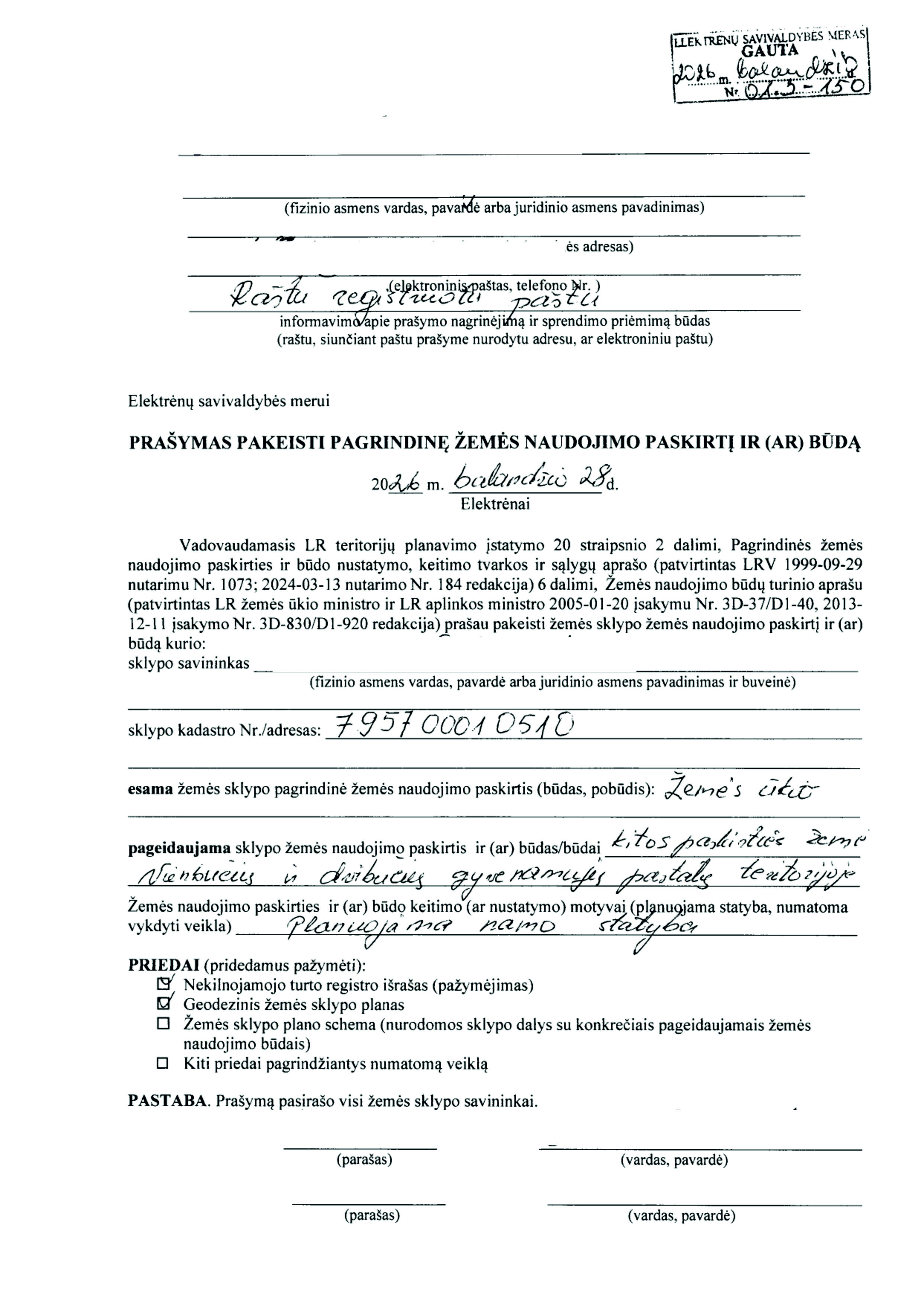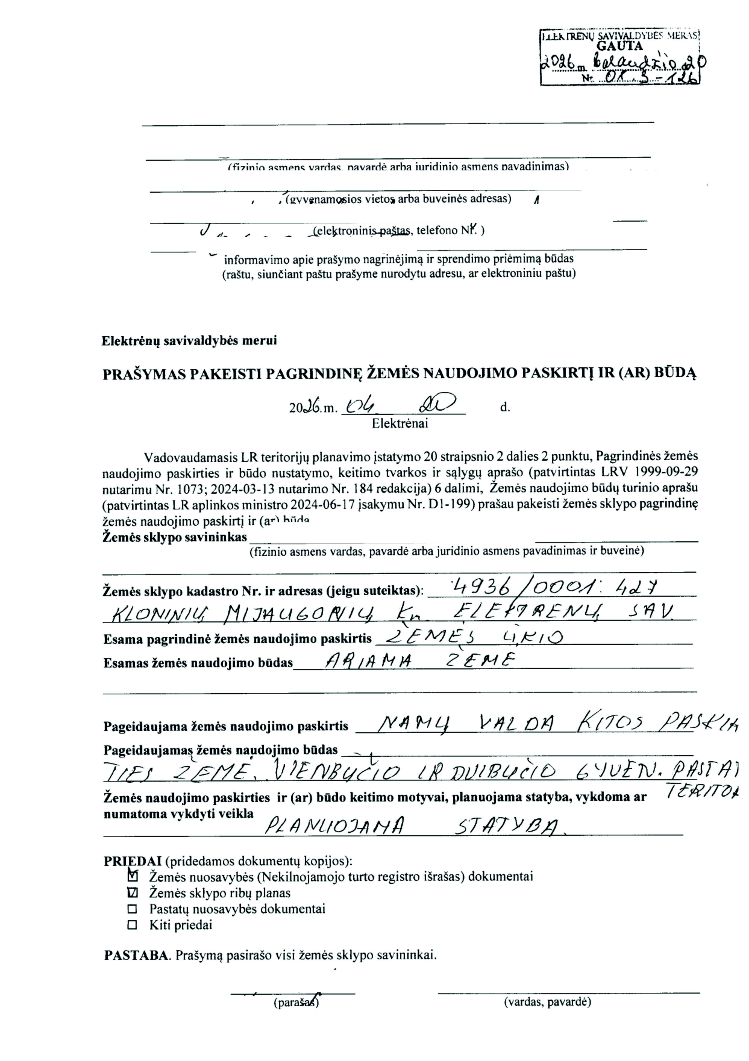 Skelbimas: Vadovaujantis Lietuvos Respublikos teritorijų planavimo įstatymo 20 straipsnio 2 dalies 2 punktu, informuojame, kad 2026-04-08 gautas prašymas (reg. Nr. 01.3-103) pakeisti žemės sklypo pagrindinę žemės naudojimo paskirtį ir būdą.