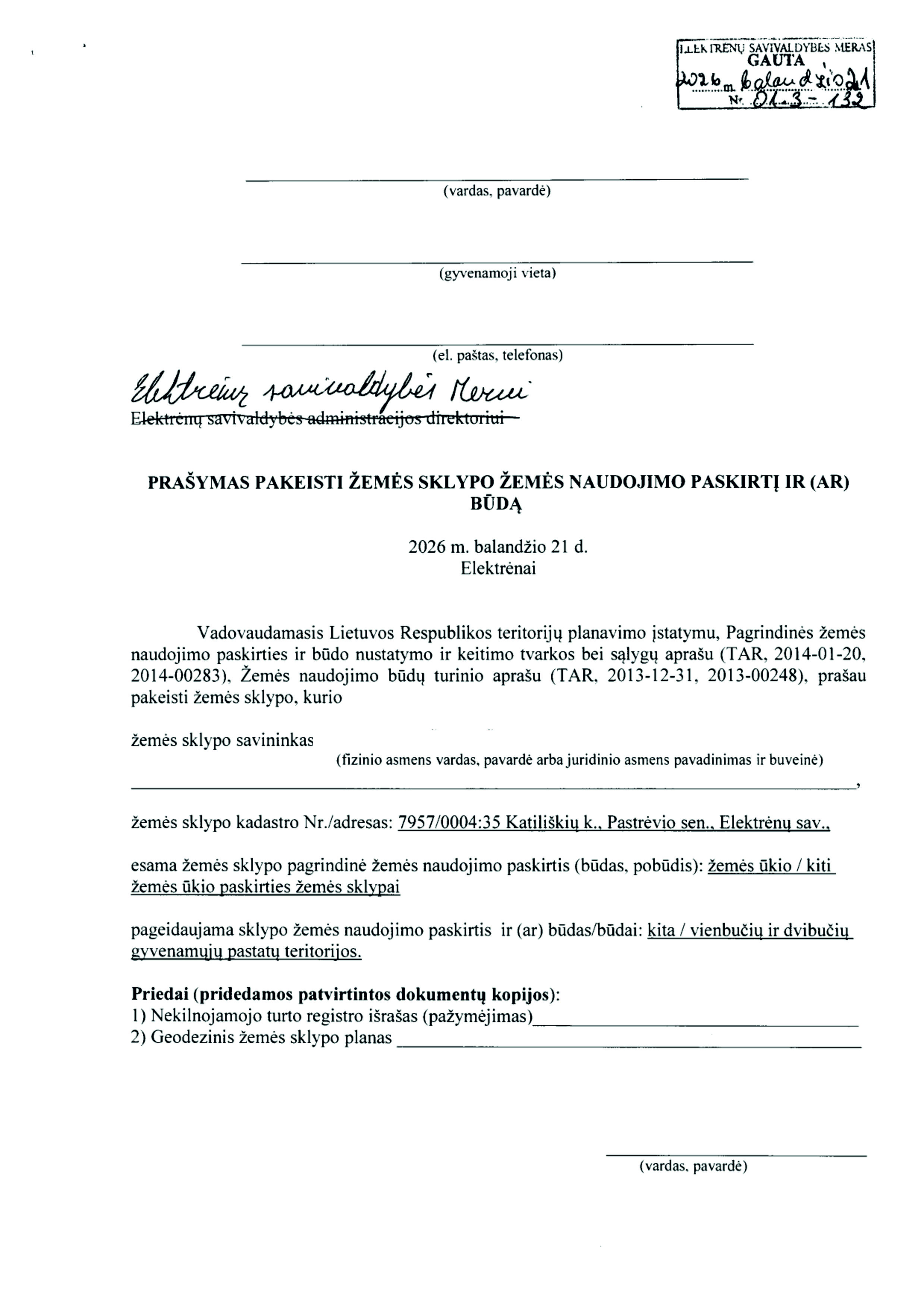Skelbimas: Vadovaujantis Lietuvos Respublikos teritorijų planavimo įstatymo 20 straipsnio 2 dalies 2 punktu, informuojame, kad 2026-04-21 gautas prašymas (reg. Nr. 01.3-132) pakeisti žemės sklypo pagrindinę žemės naudojimo paskirtį ir būdą.
