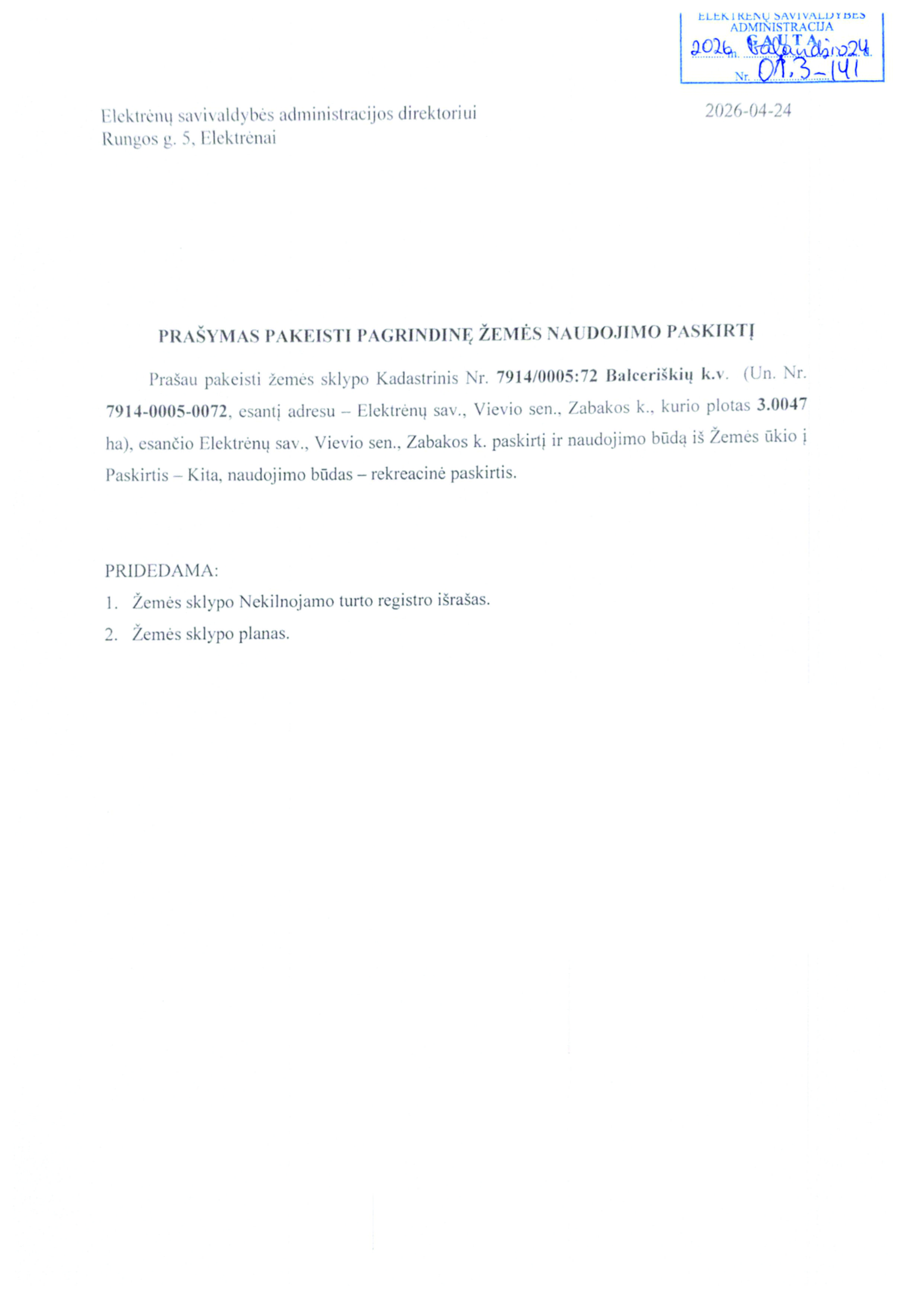 Skelbimas: Vadovaujantis Lietuvos Respublikos teritorijų planavimo įstatymo 20 straipsnio 2 dalies 2 punktu, informuojame, kad 2026-04-24 gautas prašymas (reg. Nr. 01.3-141) pakeisti žemės sklypo pagrindinę žemės naudojimo paskirtį ir būdą.