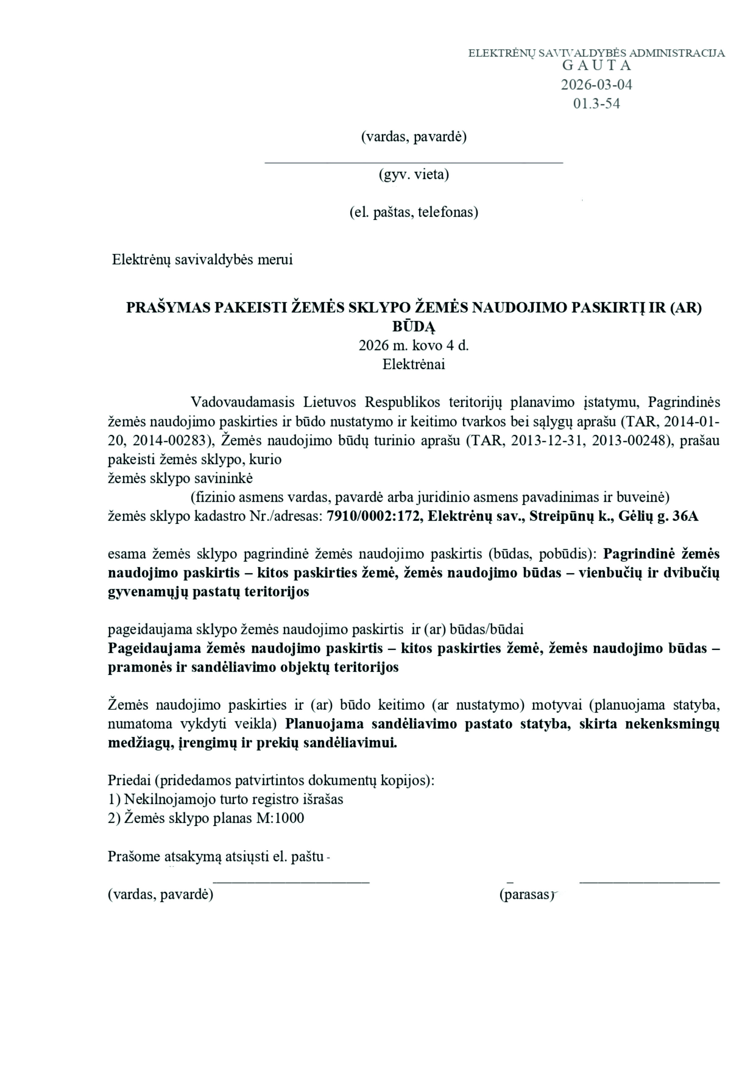 Skelbimas: Vadovaujantis Lietuvos Respublikos teritorijų planavimo įstatymo 20 straipsnio 2 dalies 2 punktu, informuojame, kad 2026-03-05 gautas prašymas (reg. Nr. 01.3-54) pakeisti žemės sklypo pagrindinę žemės naudojimo paskirtį ir būdą.
