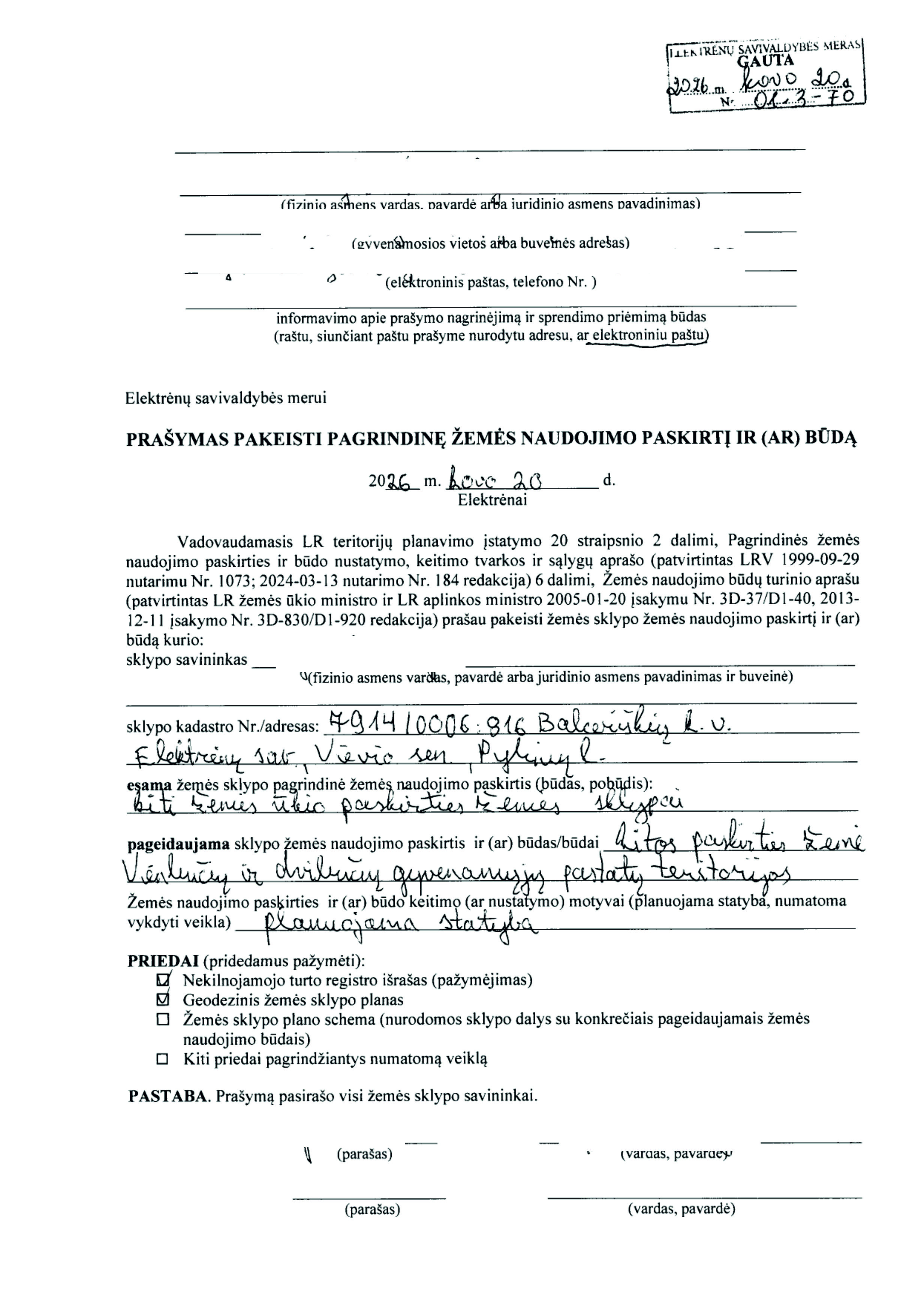 Skelbimas: Vadovaujantis Lietuvos Respublikos teritorijų planavimo įstatymo 20 straipsnio 2 dalies 2 punktu, informuojame, kad 2026-03-20 gautas prašymas (reg. Nr. 01.3-70) pakeisti žemės sklypo pagrindinę žemės naudojimo paskirtį ir būdą.