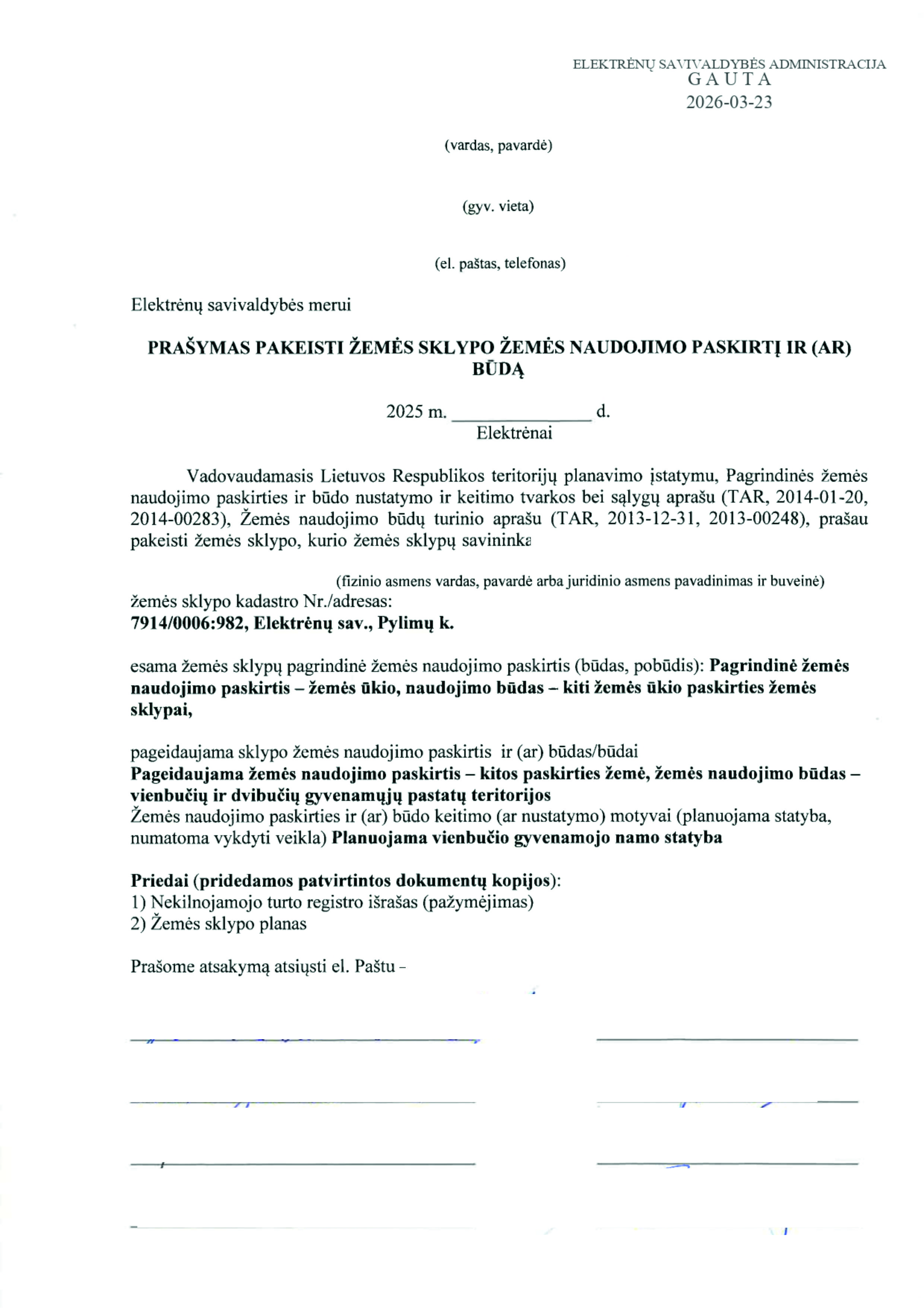 Skelbimas: Vadovaujantis Lietuvos Respublikos teritorijų planavimo įstatymo 20 straipsnio 2 dalies 2 punktu, informuojame, kad 2026-03-23 gautas prašymas (reg. Nr. 01.3-72) pakeisti žemės sklypo pagrindinę žemės naudojimo paskirtį ir būdą.