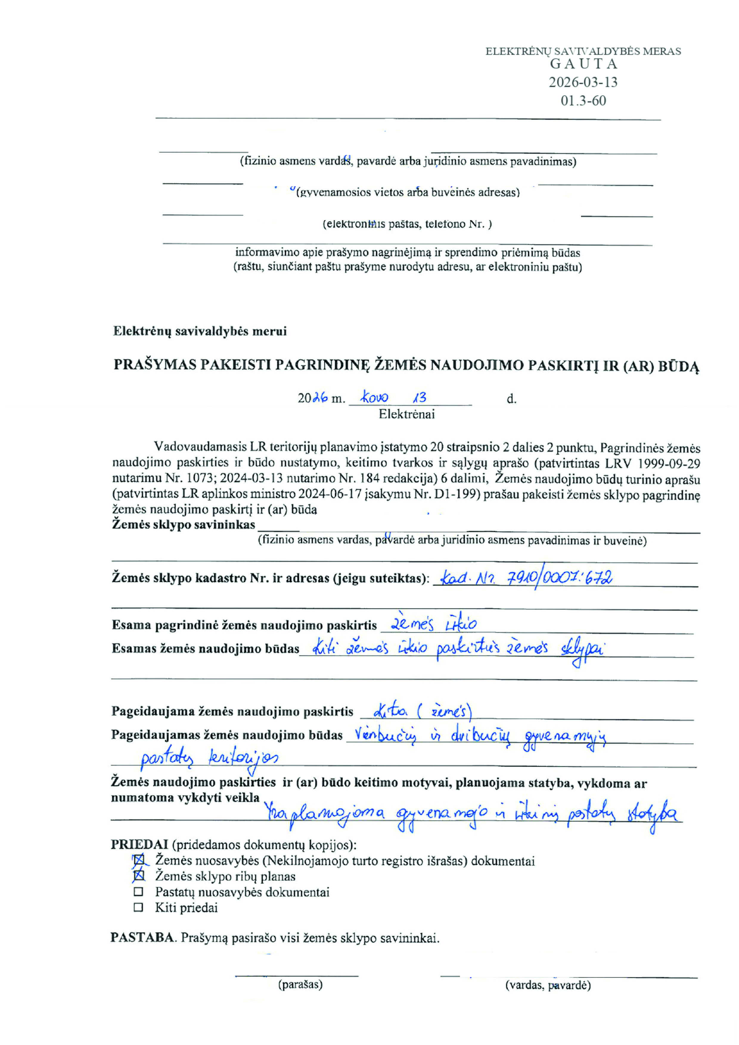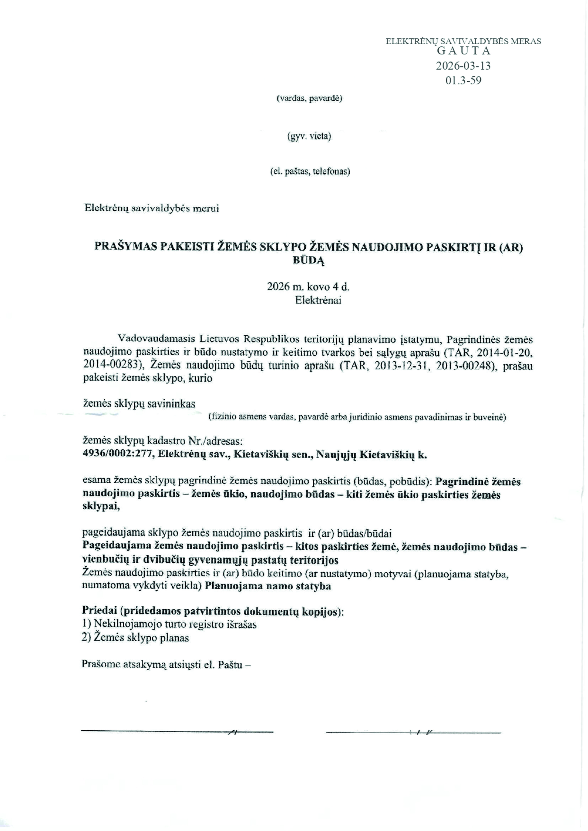 Skelbimas: Vadovaujantis Lietuvos Respublikos teritorijų planavimo įstatymo 20 straipsnio 2 dalies 2 punktu, informuojame, kad 2026-03-13 gautas prašymas (reg. Nr. 01.3-60) pakeisti žemės sklypo pagrindinę žemės naudojimo paskirtį ir būdą.