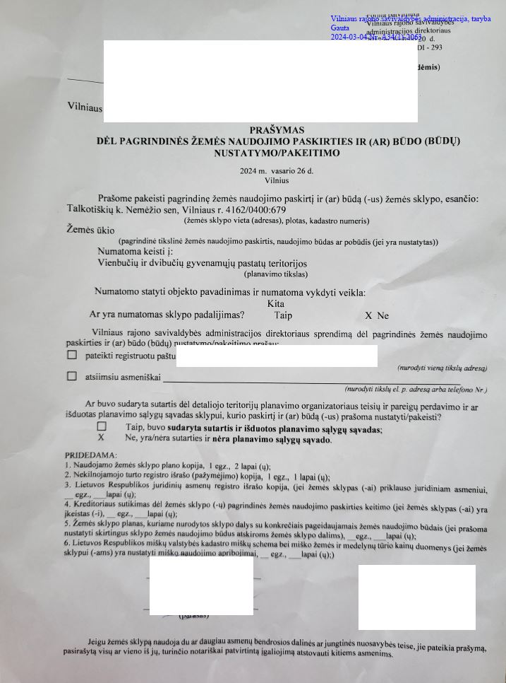 Informuojame apie pateiktą nagrinėti prašymą dėl žemės sklypo (kad. Nr. 4162/0200:1153), esančio Vilniaus r. sav., Nemėžio sen., Pakalniškių k., (toliau – Žemės sklypas) pagrindinės žemės naudojimo paskirties ir žemės naudojimo būdo keitimą. Prašymo tikslas: 0,2400 ha ploto žemės ūkio paskirties Žemės sklypo pagrindinės žemės naudojimo paskirties ir žemės naudojimo būdo keitimas į kitos - vienbučių ir dvibučių gyvenamųjų pastatų teritorijos. Su prašymu galima susipažinti nuo 2024-01-09 iki 2024-01-22 Lietuvos Respublikos teritorijų planavimo dokumentų rengimo ir teritorijų planavimo proceso valstybės priežiūros informacinėje svetainėje (TPDRIS.lt) ir Vilniaus rajono savivaldybės interneto svetainėje (vrsa.lt). Pasiūlymus dėl pagrindinės žemės naudojimo paskirties ir žemės naudojimo būdo keitimo galima teikti iki 2024-01-22 Vilniaus rajono savivaldybės administracijai (Rinktinės g. 50, Vilnius) raštu ir Lietuvos Respublikos teritorijų planavimo dokumentų rengimo ir teritorijų planavimo proceso valstybinės priežiūros informacinėje sistemoje.