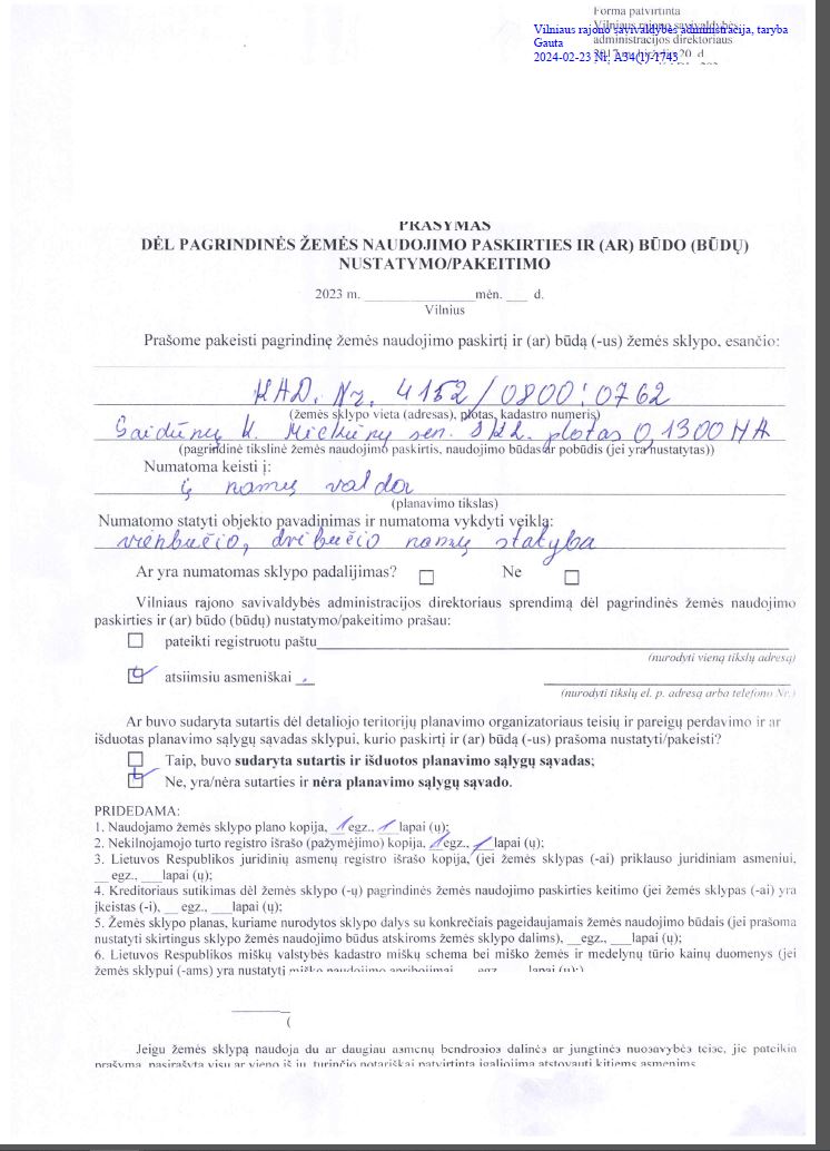Informuojame apie pateiktą nagrinėti prašymą dėl žemės sklypo (kad. Nr. 4152/0800:762), esančio Vilniaus r. sav., Mickūnų sen., Gaidūnų k., (toliau – Žemės sklypas) pagrindinės žemės naudojimo paskirties ir žemės naudojimo būdo keitimą. Prašymo tikslas: 0,1305 ha ploto žemės ūkio paskirties Žemės sklypo pagrindinės žemės naudojimo paskirties ir žemės naudojimo būdo keitimas į kitos - vienbučių ir dvibučių gyvenamųjų pastatų teritorijos. Su prašymu galima susipažinti nuo 2024-02-26 iki 2024-03-08 Lietuvos Respublikos teritorijų planavimo dokumentų rengimo ir teritorijų planavimo proceso valstybės priežiūros informacinėje svetainėje (TPDRIS.lt) ir Vilniaus rajono savivaldybės interneto svetainėje (vrsa.lt). Pasiūlymus dėl pagrindinės žemės naudojimo paskirties ir žemės naudojimo būdo keitimo galima teikti iki 2024-03-08 Vilniaus rajono savivaldybės administracijai (Rinktinės g. 50, Vilnius) raštu ir Lietuvos Respublikos teritorijų planavimo dokumentų rengimo ir teritorijų planavimo proceso valstybinės priežiūros informacinėje sistemoje.