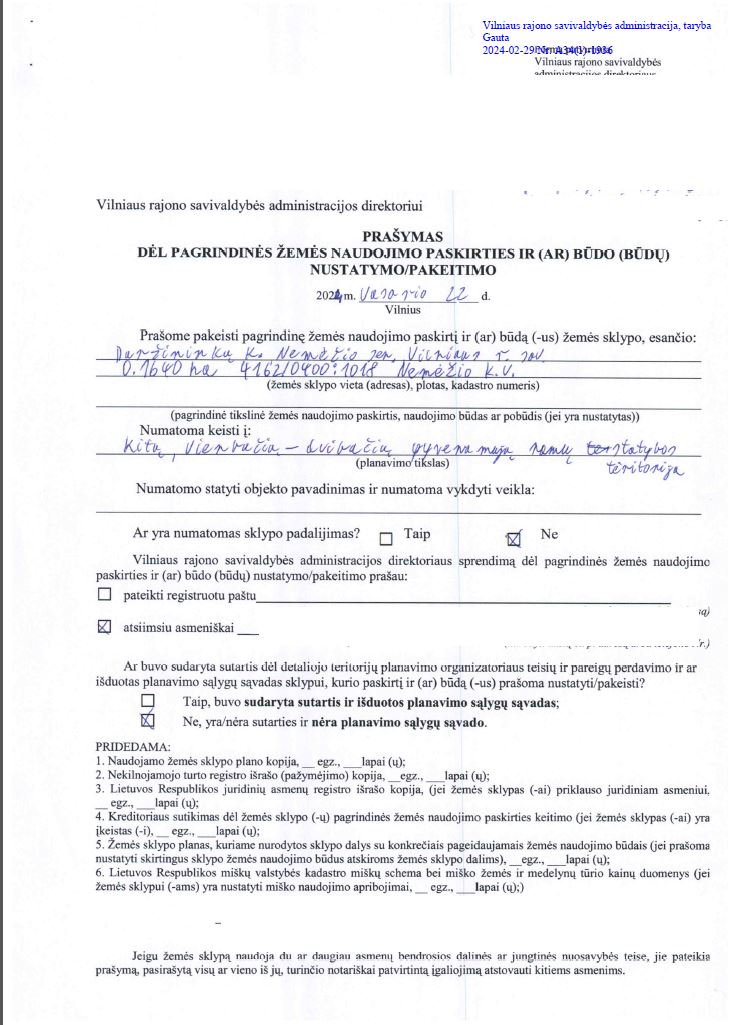 Informuojame apie pateiktą nagrinėti prašymą dėl žemės sklypo (kad. Nr. 4162/0400:1018), esančio Vilniaus r. sav., Nemėžio sen., Daržininkų k., (toliau – Žemės sklypas) pagrindinės žemės naudojimo paskirties ir žemės naudojimo būdo keitimą. Prašymo tikslas: 0,1640 ha ploto kitos paskirties Žemės sklypo žemės naudojimo būdo keitimas į kitos - vienbučių ir dvibučių gyvenamųjų pastatų teritorijos. Su prašymu galima susipažinti nuo 2024-02-29 iki 2024-03-14 Lietuvos Respublikos teritorijų planavimo dokumentų rengimo ir teritorijų planavimo proceso valstybės priežiūros informacinėje svetainėje (TPDRIS.lt) ir Vilniaus rajono savivaldybės interneto svetainėje (vrsa.lt). Pasiūlymus dėl pagrindinės žemės naudojimo paskirties ir žemės naudojimo būdo keitimo galima teikti iki 2024-03-14 Vilniaus rajono savivaldybės administracijai (Rinktinės g. 50, Vilnius) raštu ir Lietuvos Respublikos teritorijų planavimo dokumentų rengimo ir teritorijų planavimo proceso valstybinės priežiūros informacinėje sistemoje.