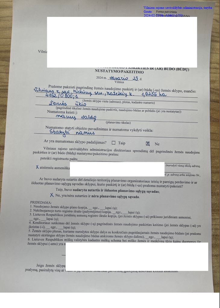 Informuojame apie pateiktą nagrinėti prašymą dėl žemės sklypo (kad. Nr. 4144/0100:94), esančio Vilniaus r. sav., Lavoriškių sen., Lavoriškių k., (toliau – Žemės sklypas) pagrindinės žemės naudojimo paskirties ir žemės naudojimo būdo keitimą. Prašymo tikslas: 0,1458 ha ploto žemės ūkio paskirties Žemės sklypo pagrindinės žemės naudojimo paskirties ir žemės naudojimo būdo keitimas į kitos - vienbučių ir dvibučių gyvenamųjų pastatų teritorijos. Su prašymu galima susipažinti nuo 2024-02-21 iki 2024-03-06 Lietuvos Respublikos teritorijų planavimo dokumentų rengimo ir teritorijų planavimo proceso valstybės priežiūros informacinėje svetainėje (TPDRIS.lt) ir Vilniaus rajono savivaldybės interneto svetainėje (vrsa.lt). Pasiūlymus dėl pagrindinės žemės naudojimo paskirties ir žemės naudojimo būdo keitimo galima teikti iki 2024-03-06 Vilniaus rajono savivaldybės administracijai (Rinktinės g. 50, Vilnius) raštu ir Lietuvos Respublikos teritorijų planavimo dokumentų rengimo ir teritorijų planavimo proceso valstybinės priežiūros informacinėje sistemoje.